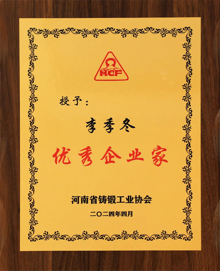 ? ? ?在2024年河南省鑄鍛工業(yè)年會(huì)上,公司被評(píng)為“河南省鑄鍛行業(yè)綠色鑄造示范企業(yè)”榮譽(yù)稱(chēng)號(hào),并被授予“鑄鍛行業(yè)優(yōu)-秀企業(yè)”。李總被授予“優(yōu)-秀企業(yè)家”稱(chēng)號(hào)。